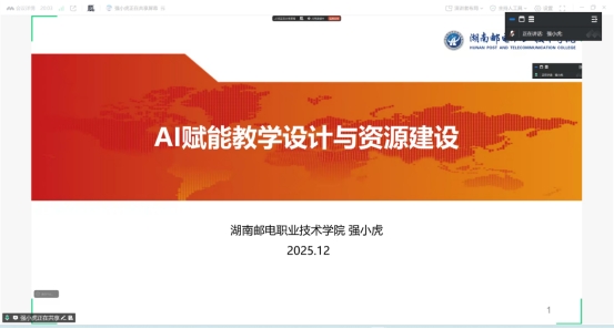 (供稿:刘锦峰)为持续推进职业教育数字化转型,提升教师智能化教学能力,2025年12月19日晚,由“智联数商”虚拟教研室主办、湖南邮电职业技术学院承办的第二期云端教研活动顺利开展。本次活动以“AI赋能教学设计与资源建设”为主题,邀请湖南邮电职院人工智能学院强小虎教授担任主讲,通过腾讯会议在线进行,吸引了来自多所院校的教师代表参与学习与互动。